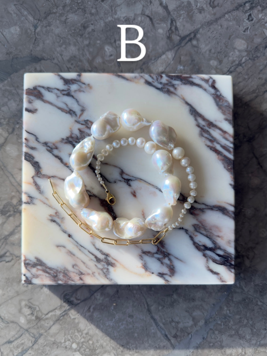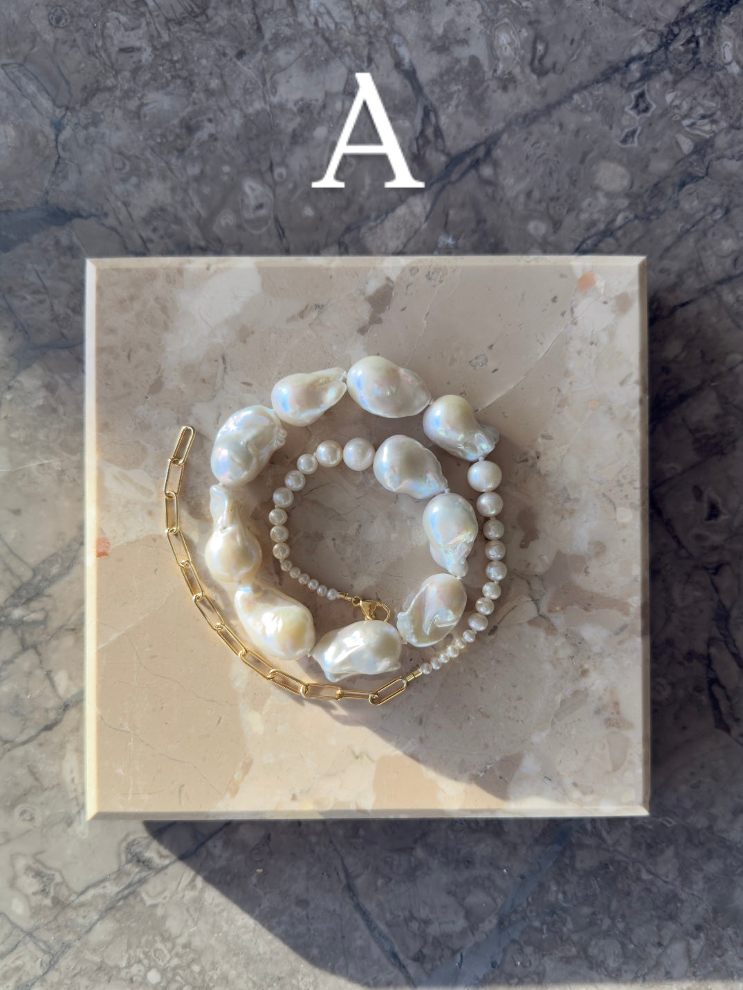 Kæderne er lavet af smukke hvide barokke og runde ferskvandsperler. De kan forlænges og måler ca 38,5-48cm. Låsen og forlængerkæden består af forgyldt 925 Sterling sølv.