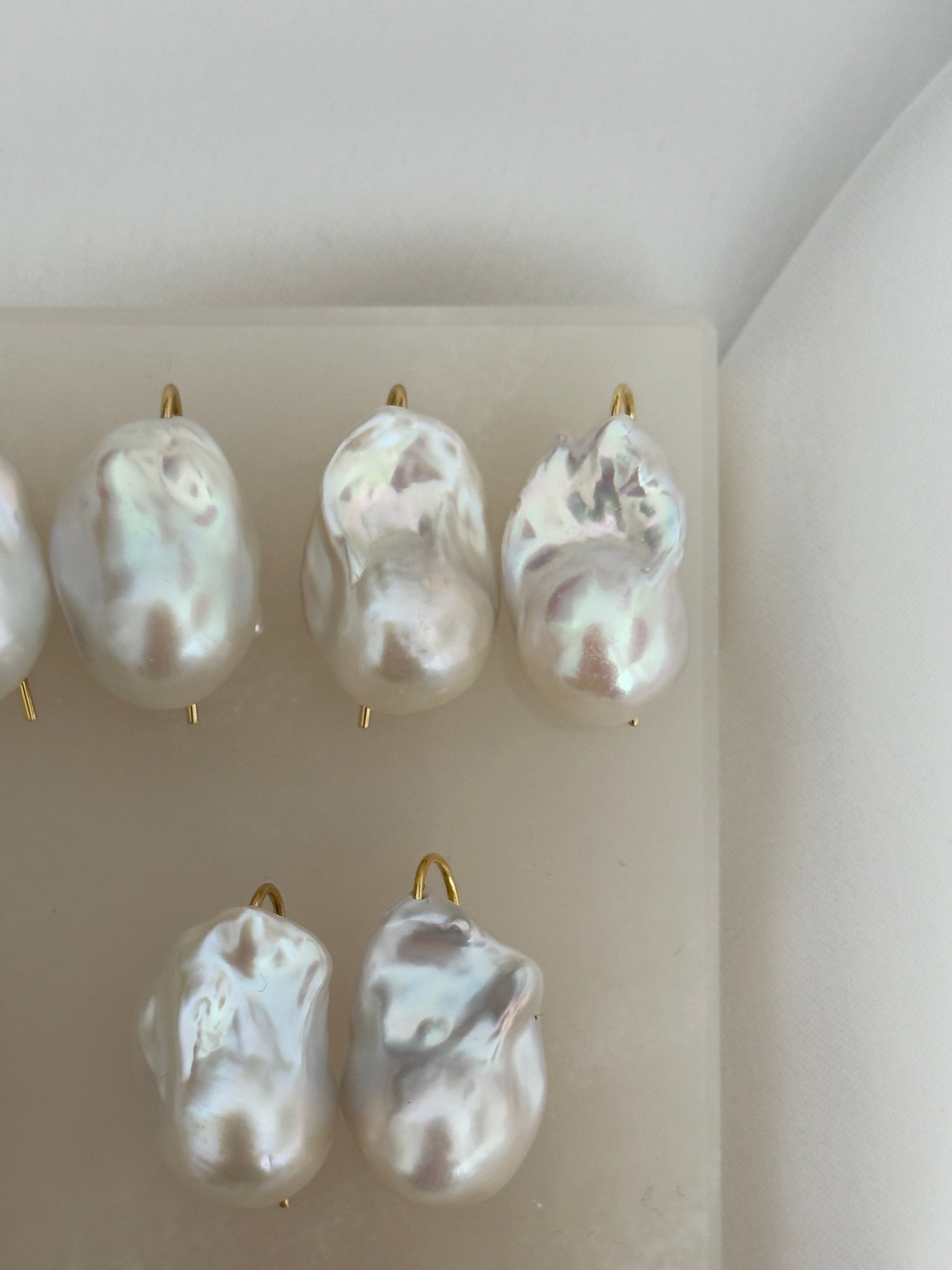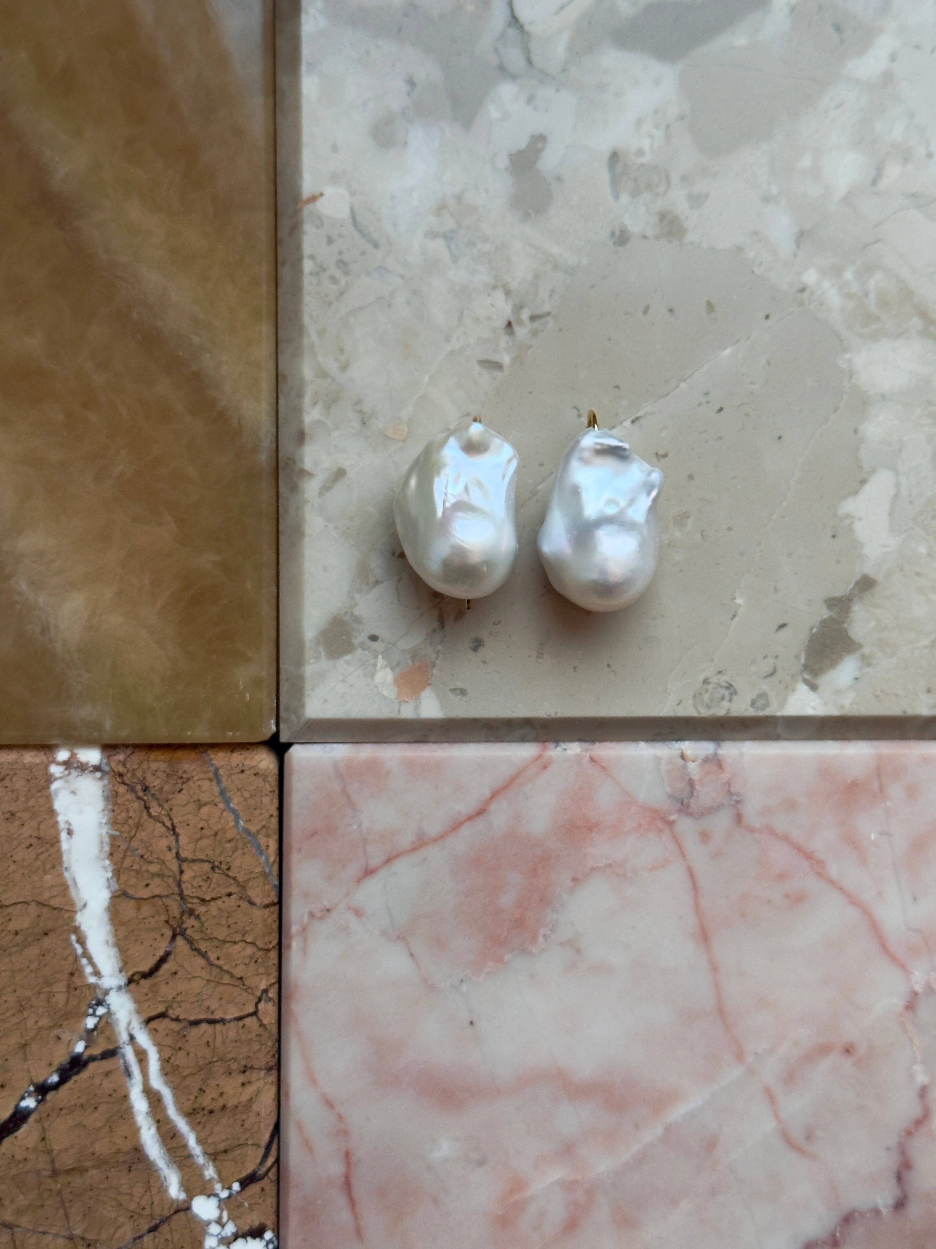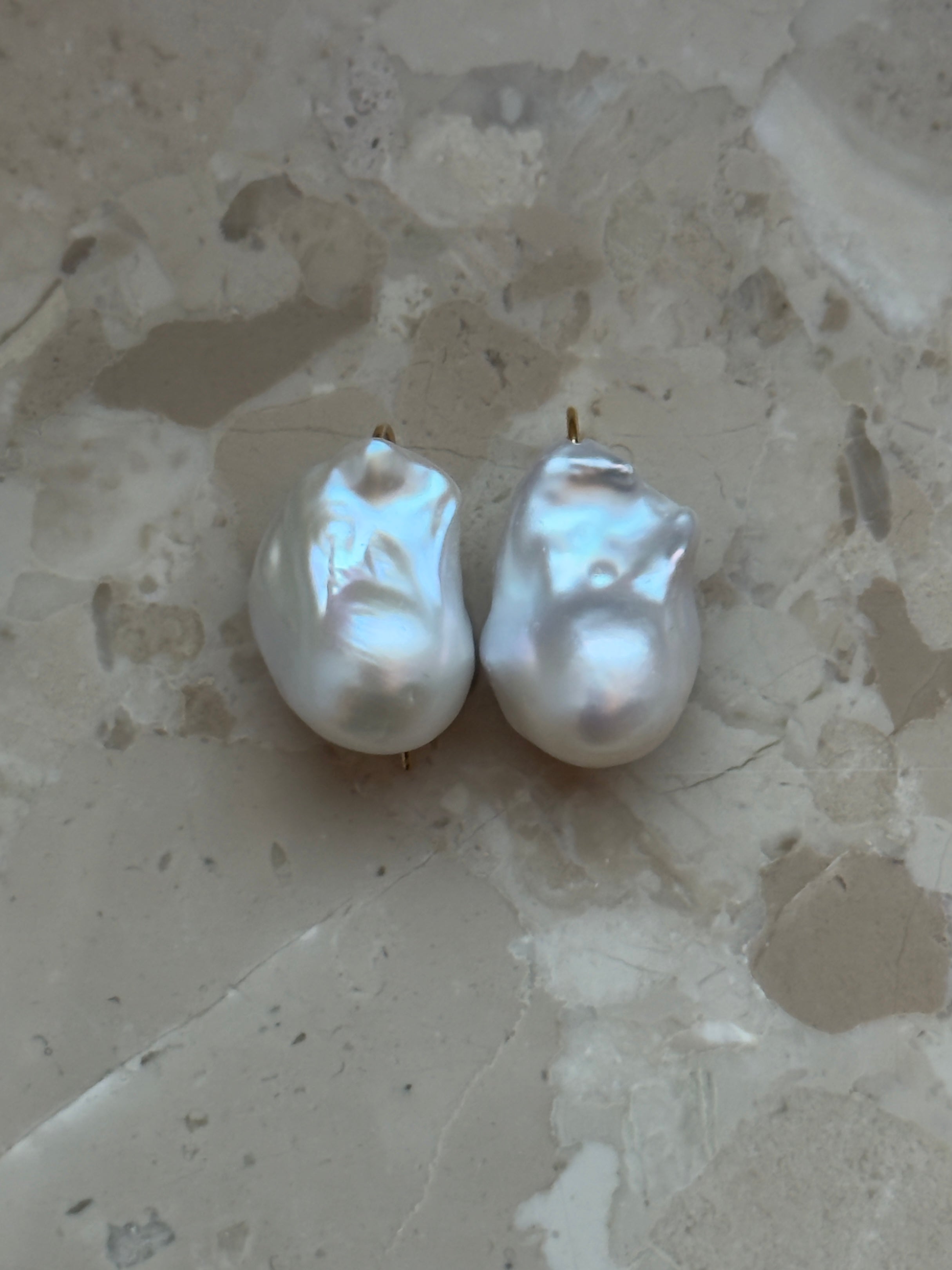 De store, smukke hvide barokke ferskvandsperler er monteret på en ørekrog med gummilås bagpå, så de bliver siddende sikkert. Ørekrogen er fremstillet i forgyldt 925 sterlingsølv. De omtrentlige mål på perlerne kan ses på et af billederne.