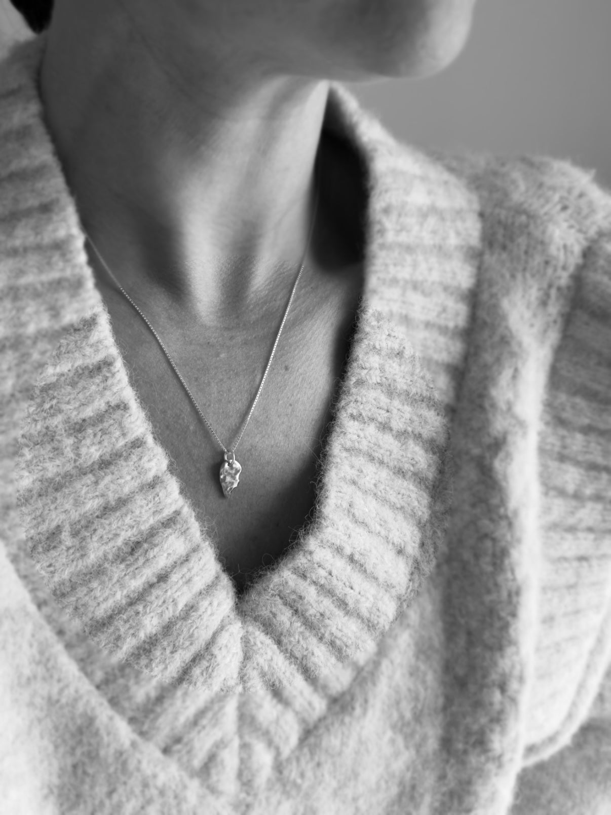 Hjerterne er håndlavet af mig, og overfladen har et organisk og naturligt udtryk, der giver hvert smykke et blødt og levende look.