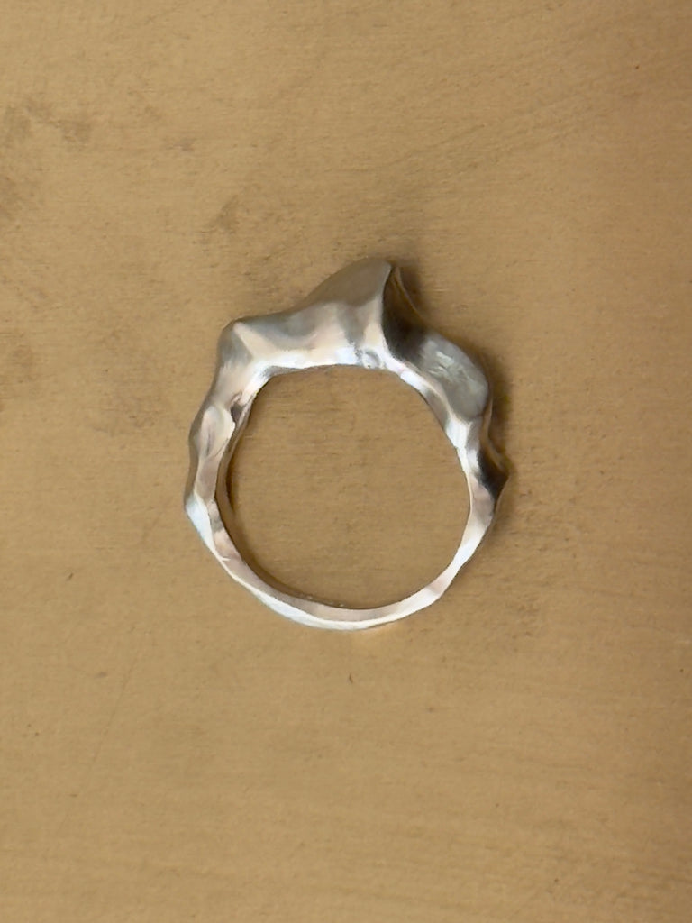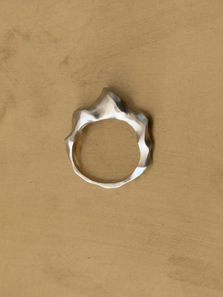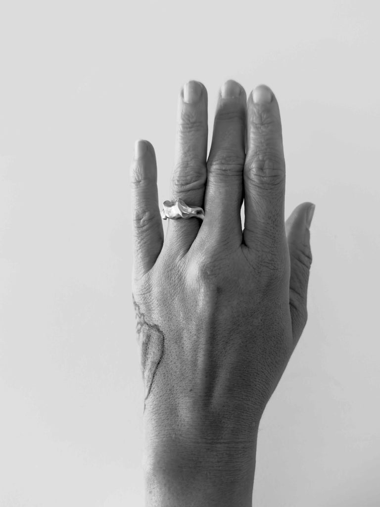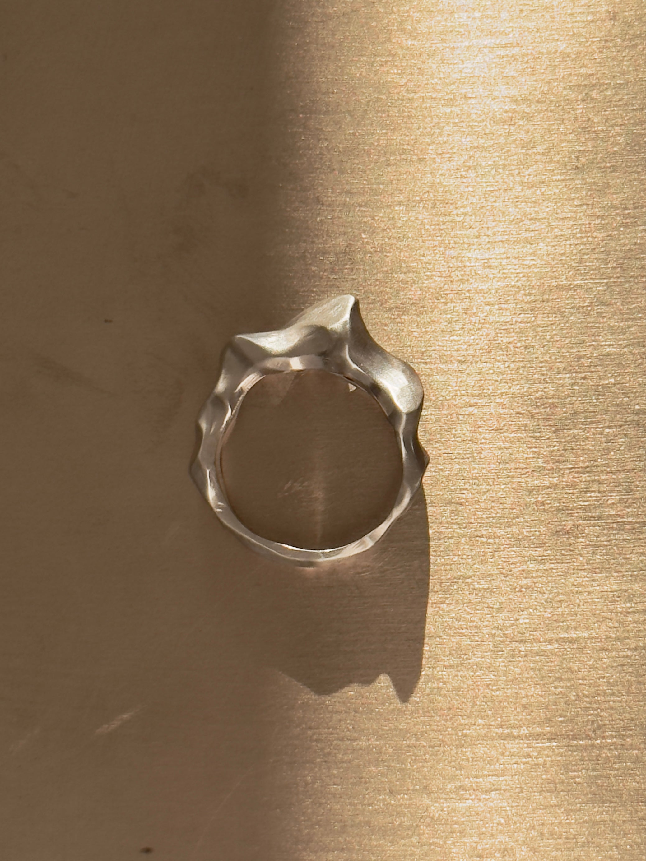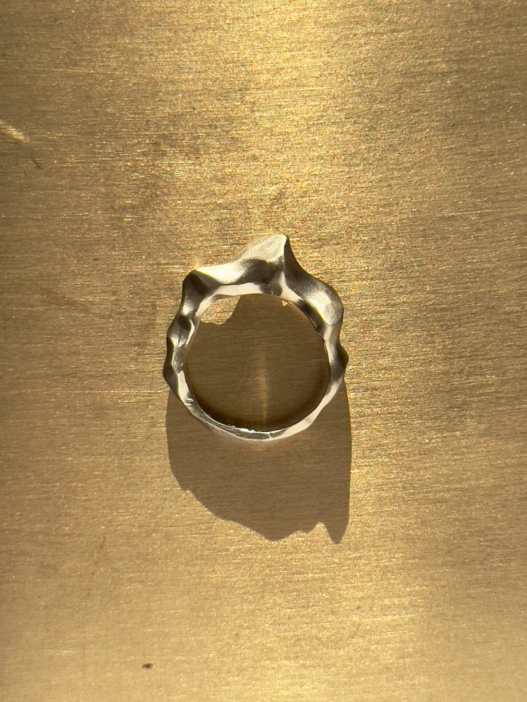 Denne ring er enkel og utrolig smuk. Det vigtige for mig ved at lave denne, var formen og at skabe en balance mellem det markante og fine i strukturen. Den har lidt de samme mønstre som det smukke sand ved kysten efter vinden har blæst forbi.